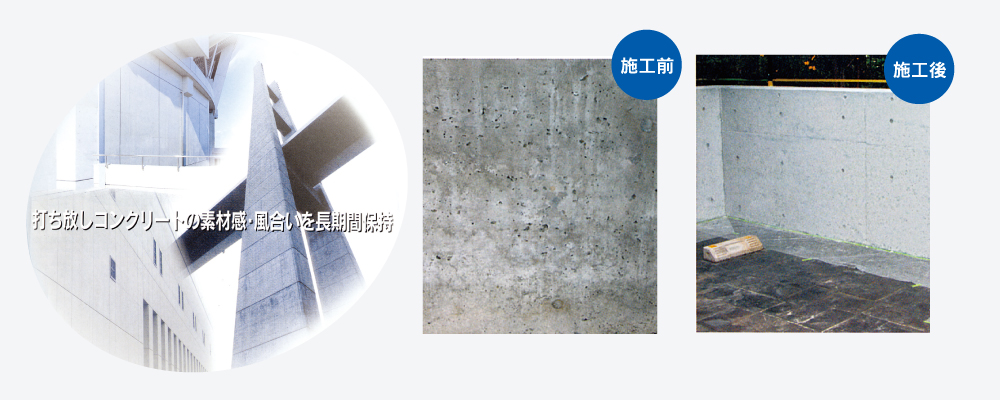 打ち放しコンクリートは、経年とともに劣化が進み、汚れも顕在化し、素材感・風合いを損ねてきます。
