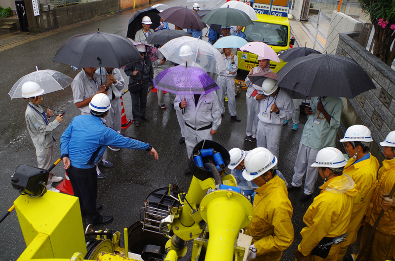 福岡市の依頼により、JICA(国際協力機構)の皆様を迎えて下水道の高圧洗浄車清掃ならびにTVカメラ調査のデモを実施。