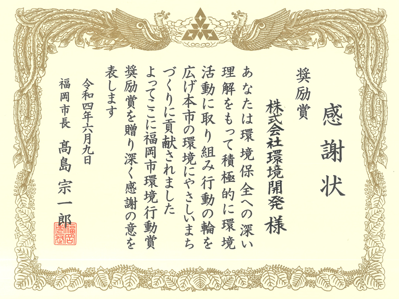 継続した活動、ならびに模範になるものとして評価され、福岡市環境行動賞「奨励賞」を戴きました。