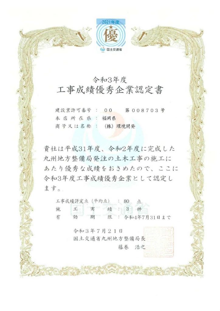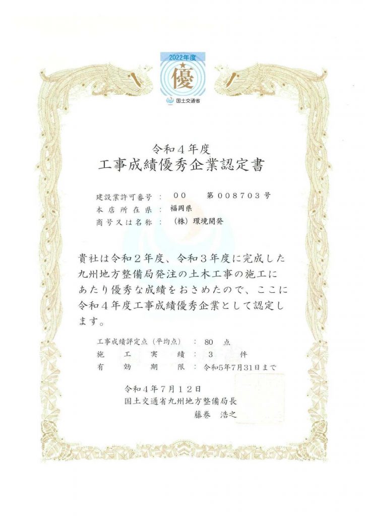 令和4年度国土交通行省九州地方整備局「工事成績優秀企業認定書」