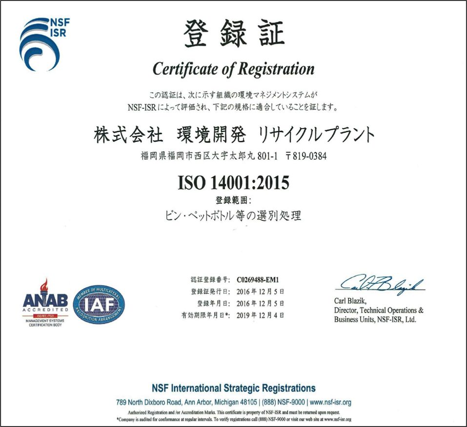 弊社は、平成13年4月から稼動をはじめた空きびん・ペットボトルの「リサイクルプラント」(福岡市西区大字太郎丸801-1)において、環境マネジメントシステムを構築し『ISO14001』を認証取得いたしました。
