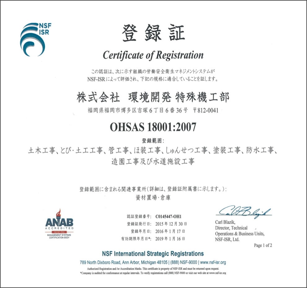 平成25年1月17日付、OHSAS18001:2007(労働安全衛生マネジメントシステム)の認証取得をいたしました。