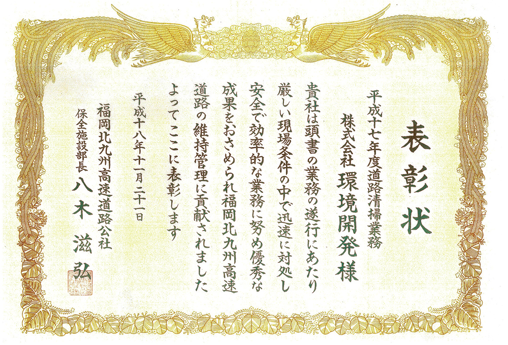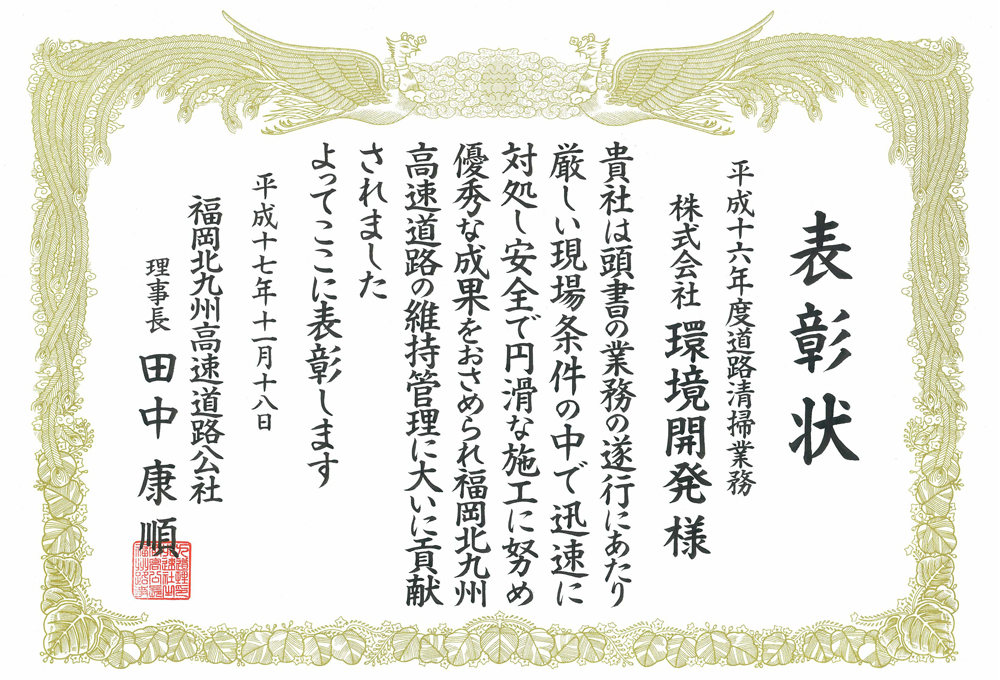 平成16・17年度に弊社の施工により完成した道路清掃業務が「優良工事」に選ばれ、2年連続で福岡北九州高速道路公社より表彰を受賞しました。