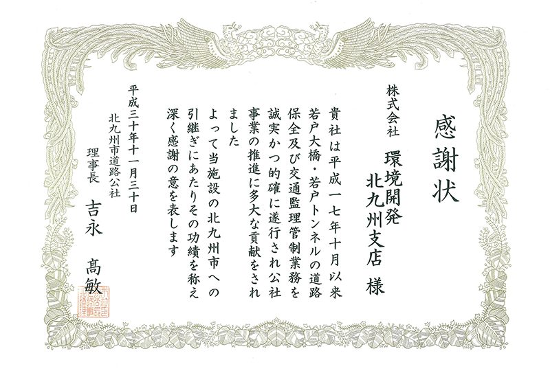 北九州市道路公社より「感謝状」が授与されました。