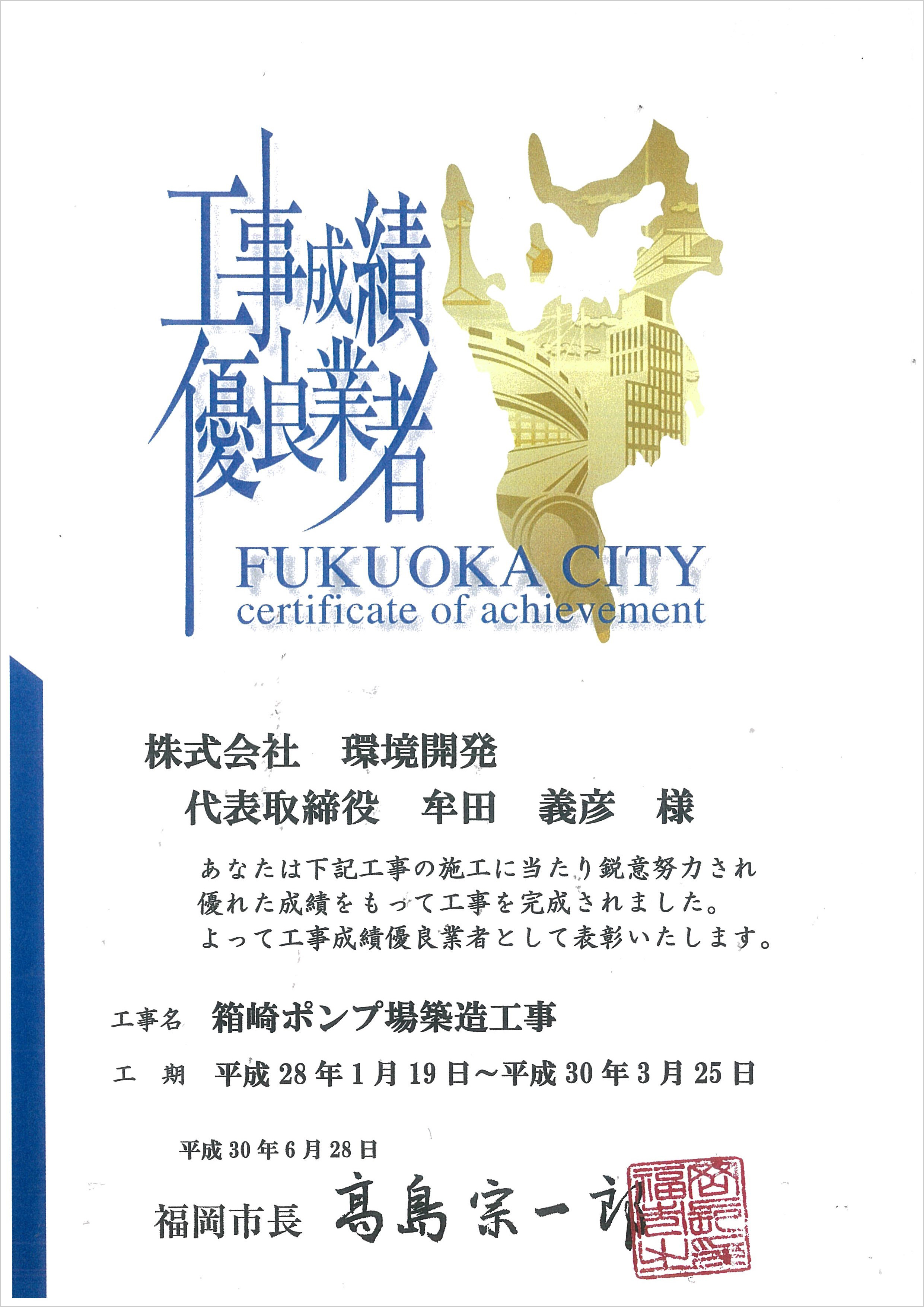 「箱崎ポンプ場築造工事」が「工事成績優良業者」として福岡市長より表彰を受賞しました。