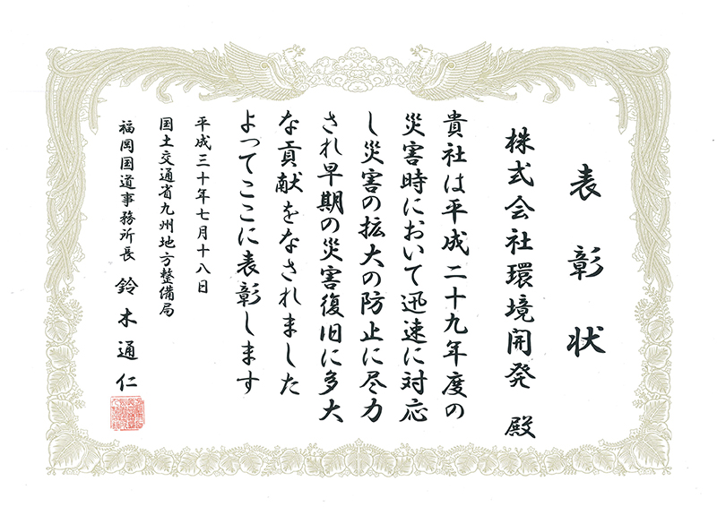 平成29年度に発生しました、九州北部豪雨災害への迅速な復旧支援が評価されました。